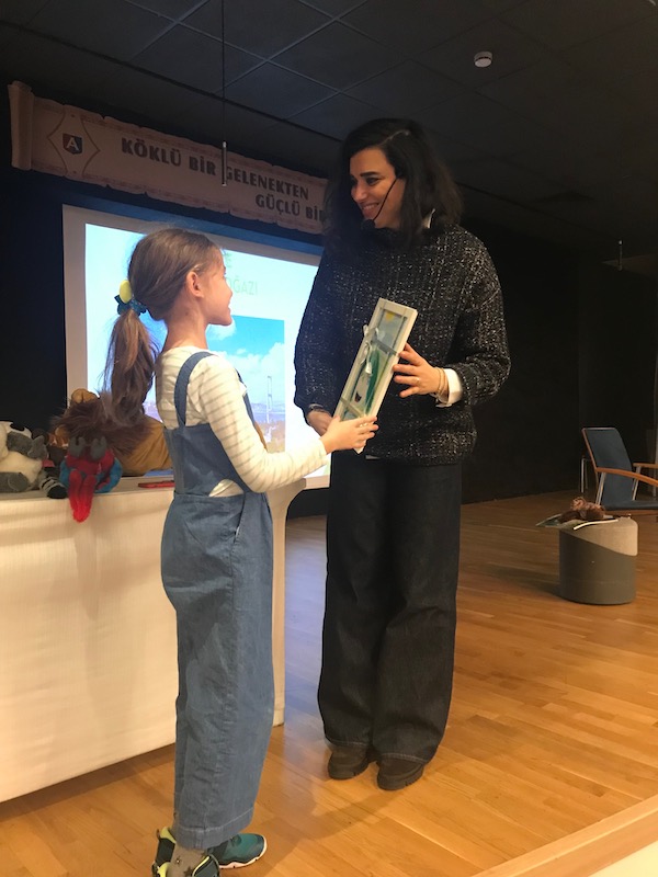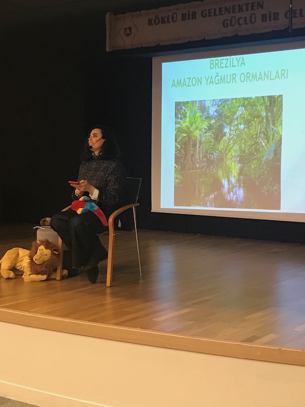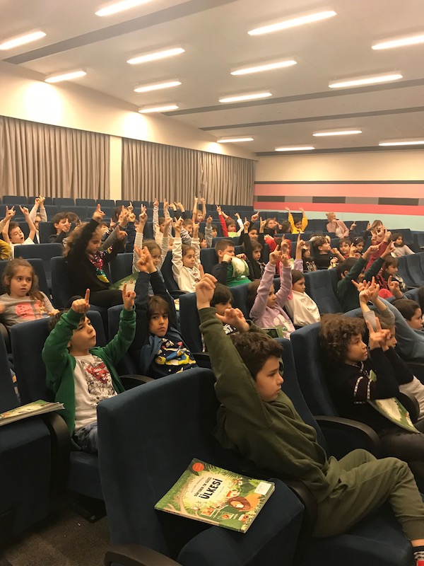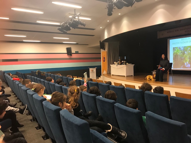 Çocuklarımız kitaptaki ülkelerle ilgili akıllarında kalan soruları sorarken, yazarımız da getirdiği peluş hayvanlarla bizlere ilave bilgiler verdi. Son olarak, çocuklarımızın kitaplarını da imzalayarak bu güzel etkinliğimizi bitirdik.