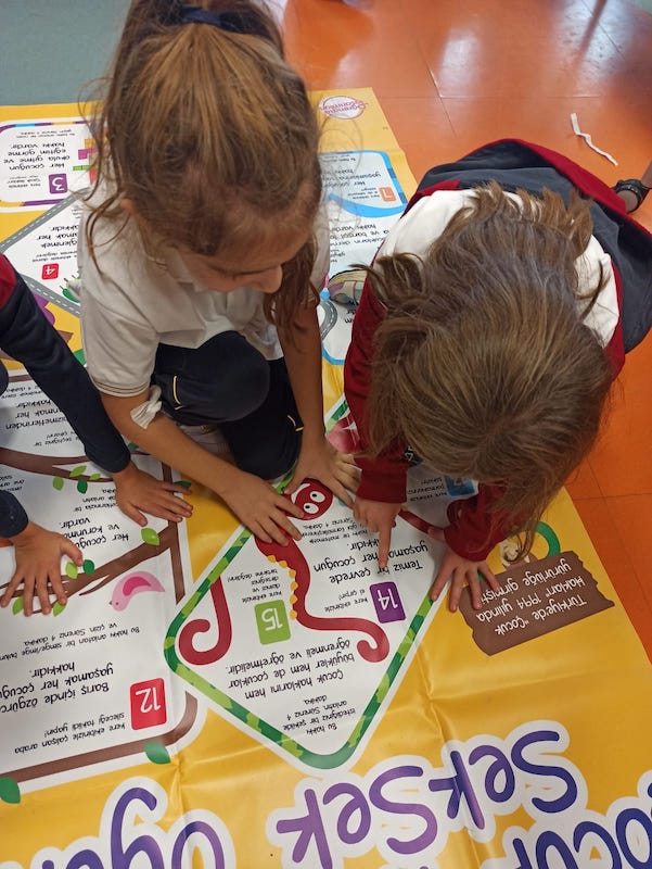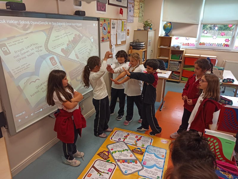 Bizler de bu hafta okulumuzda Dünya Çocuk Hakları Günü kapsamında 2 ve 3. Sınıflar olarak etkinliklerimizi gerçekleştirdik. Çocuk haklarının neler olduğunu öğrendikten sonra oynadığımız “Çocuk Hakları Sek Sek Oyunu” ile canlandırma, tekerleme yazma, heykelcilik, şarkı söyleme gibi birçok farklı alanı kullanarak haklar konusunu derinleştirdik.
