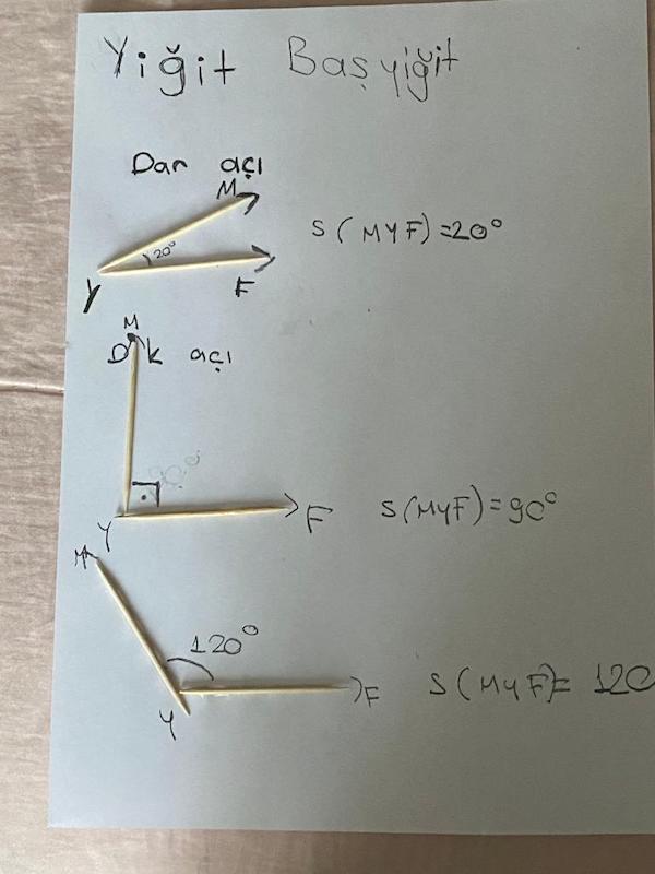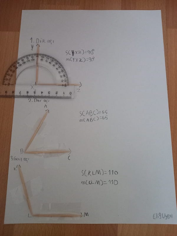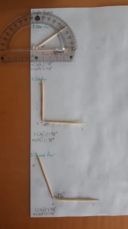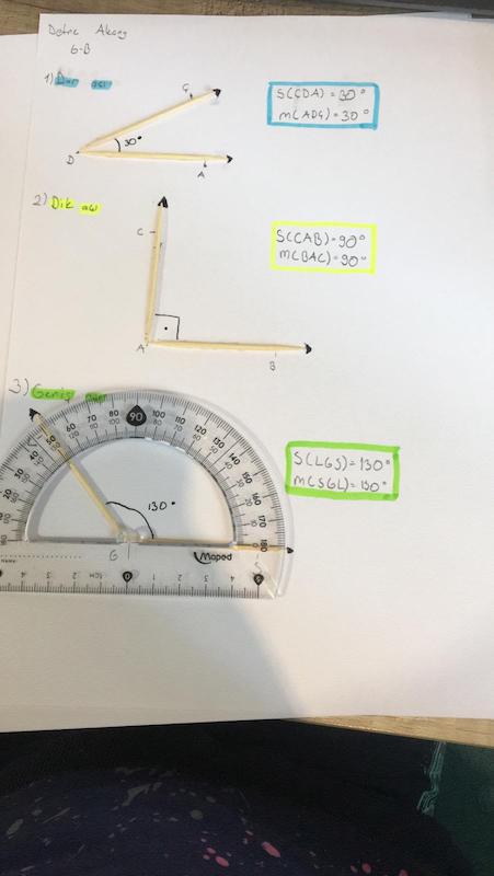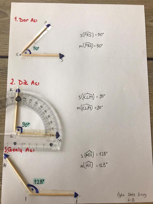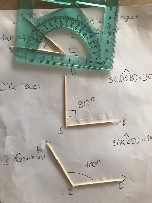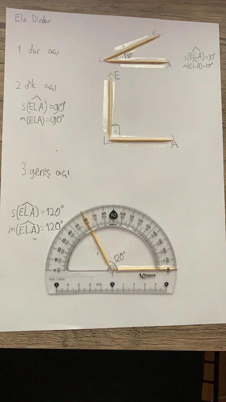 6. sınıf öğrencilerimiz matematik dersinde 5. üniteye giriş yaptılar. Öğrencilerimiz açılar konusunda açıölçer kullanmayı deneyimlediler. Derste kullanacağımız manipülatifleri ev ortamında bulabileceğimiz malzemelerden seçtik. Çevrim içi olarak yaptığımız derste, evde pratik olarak bulunan kürdanları kullanarak açı oluşturdular. Her bir öğrencimiz bireysel olarak kürdanlar yardımıyla dar açı, dik açı ve geniş açı oluşturdular. Oluşturdukları açıları modellediler ve isimlendirdiler. Kendi açılarını açıölçerleri ile ölçümleyip buldukları açı ölçülerini kurallarına uygun olarak yazdılar. Deneyimleyerek ve eğlenerek açılar konusunu öğrendiler.