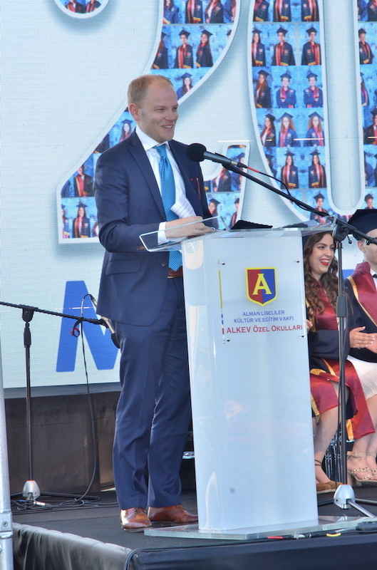 Alman Kültür Ateşesi Herr Laufer, Alman Liseliler Kültür ve Eğitim Vakfı kurucularımız, üyelerimiz, yöneticilerimiz, öğretmenlerimiz ve ailelerin katıldığı törende coşku, gurur, sevgi ve hüzün bir aradaydı. Mezunlarımızın ALKEV’den aldıkları eğitim, bilgi ve kültürle ülkemizin ve insanlığın gelişmesinde bilimin takipçisi, Atatürk ilkelerine bağlı, çağdaş anlayışın ışığında üniversite hayatlarında da başarılı bireyler olacağından kuşkumuz yok. Tüm mezunlarımızı yürekten kutluyor ve bundan sonraki hayatlarında başarılarının devamını diliyoruz.