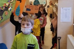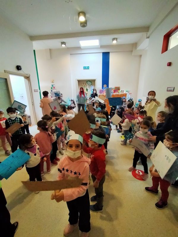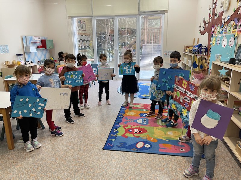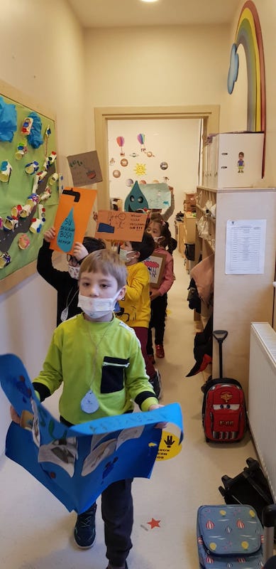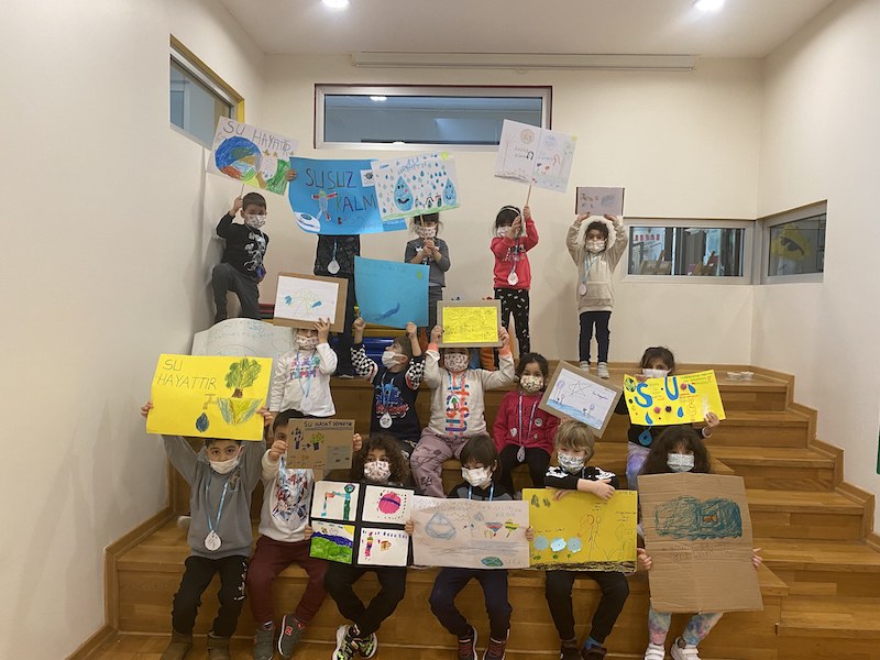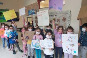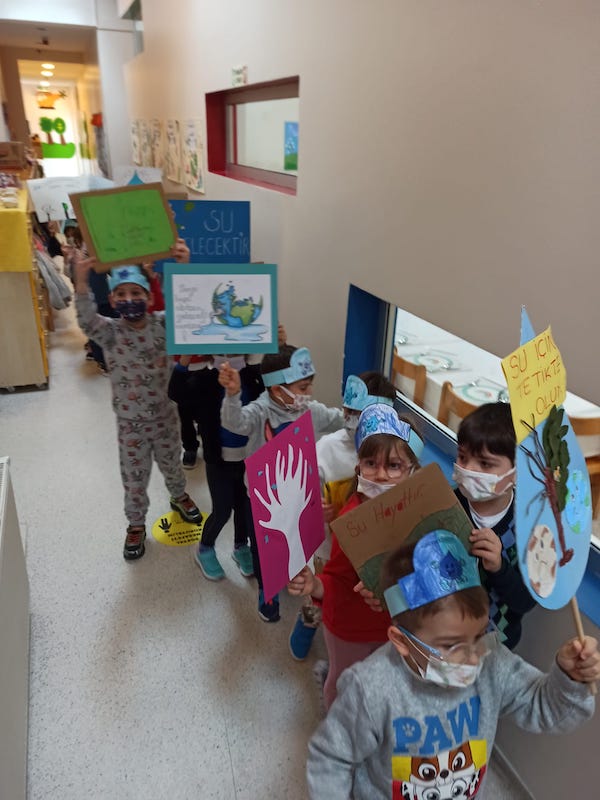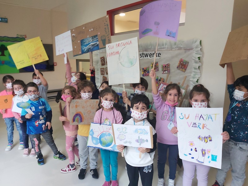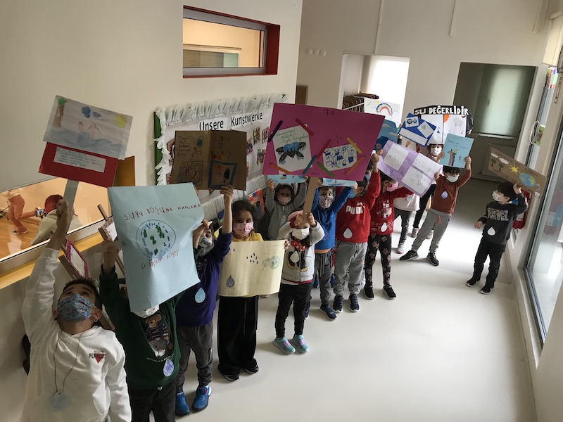 Dünya Su Günü için pankartları ile okula gelen anaokulu öğrencilerimiz, “Wasser ist Leben”, “Su hayattır”, “Suyumuzu koruyalım” vb. sloganları ile okul içerisinde yürüyüş yaptılar.
