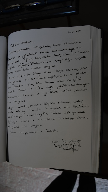 Resmî törenin ardından okul müdürü tarafından Anıtkabir Özel Defteri imzalanarak ALKEV camiasının Atatürk ilke ve devrimlerine bağlılığı bir kez daha vurgulandı.