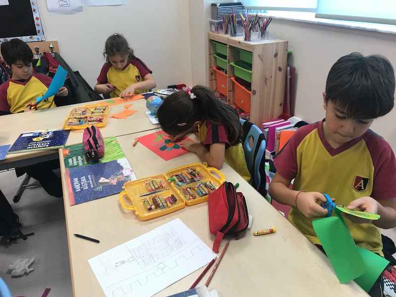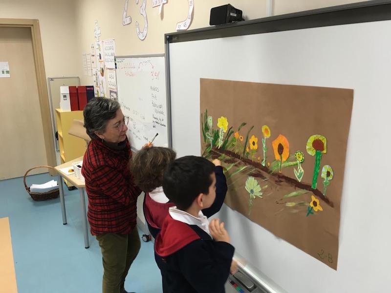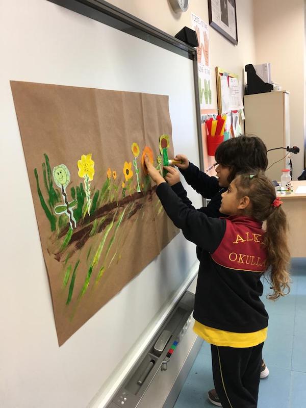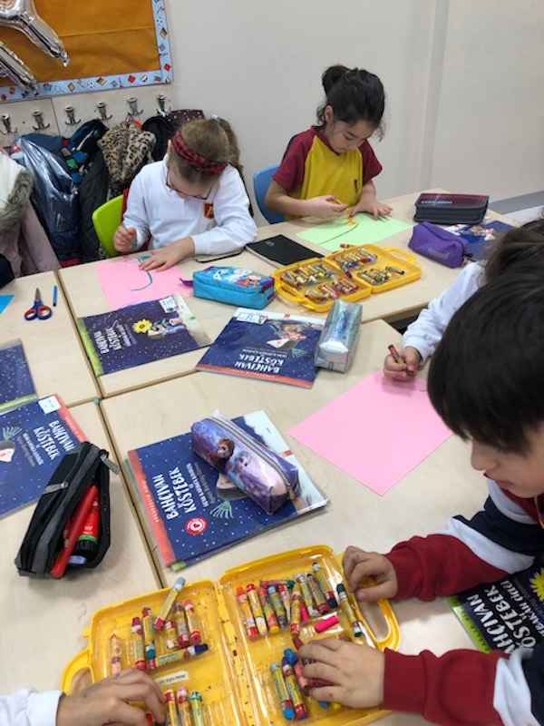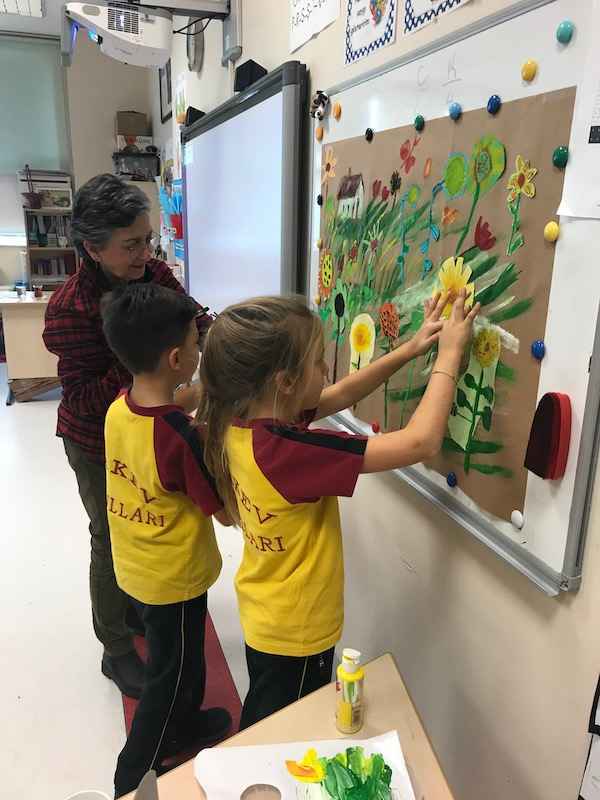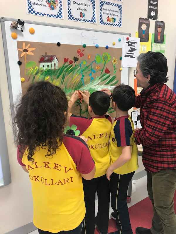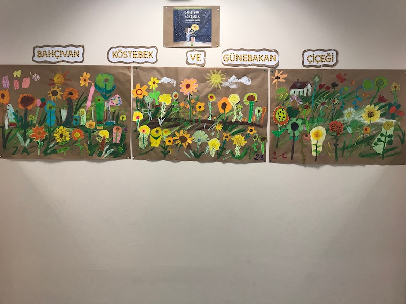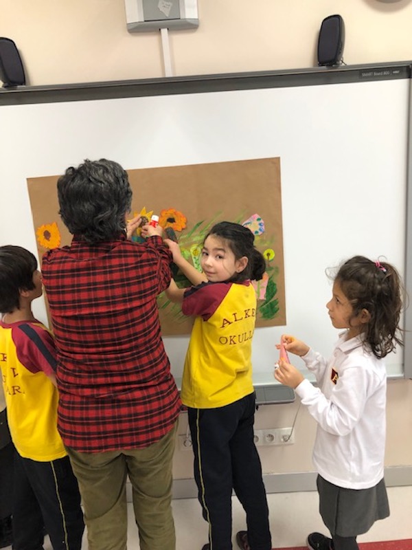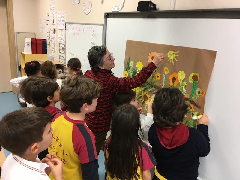 Yazarımız, sınıflarımızı sırayla ziyaret ederek çocuklarımızla kitap üzerine sohbet etti. Ayrıca öğrencilerimizin yaptığı rengârenk günebakan çiçekleriyle harika bir kompozisyon oluşturdu. Böylece çocuklarımız yazarımızın ressam yönünü de görmüş oldu.