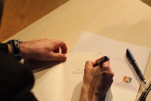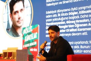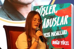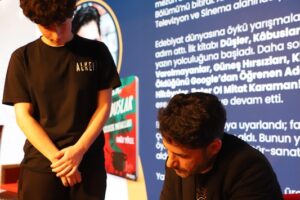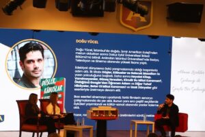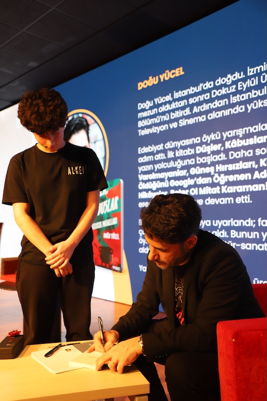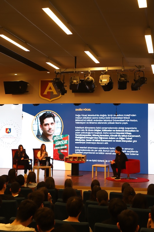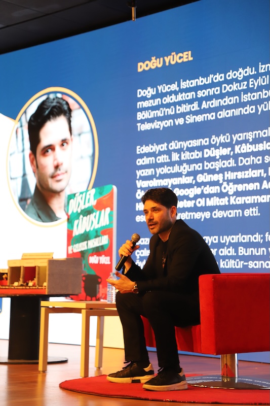 Doğu Yücel; yazarlık süreci, ilham kaynakları ve edebiyatın gerçekliği yeniden kurma gücü üzerine samimi paylaşımlarda bulunurken öğrencilerin yönelttiği sorularla söyleşi daha da zenginleşti. Söyleşinin ardından Yücel, öğrencilerin kitap ile ilgili hazırladıkları yaratıcı ürünlerden oluşan sergiyi ziyaret etti.