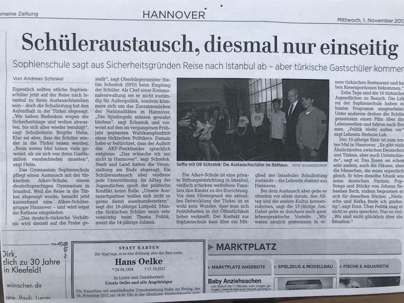 Kardeş okulumuz Sophienschule-Hannover ile geleneksel öğrenci değişim programımız bu sene 28.10.-05.11.2017 tarihleri arasında ALKEV Özel Anadolu ve Fen Lisesinin 9. sınıfında okuyan toplam 16 öğrencisi ve 2 öğretmeni ile gerçekleştirilmiştir.