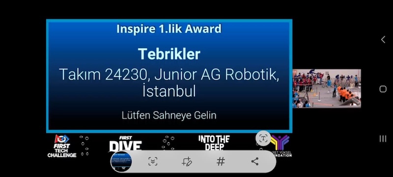 Bununla birlikte yine FIRST Tech Challenge 1. Üsküdar Turnuvası’nda turnuvanın en prestijli ödülü olan Inspire Award’u kazandı.Inspire Award hakkında FIRST Vakfı tarafından ödül tanımı aşağıdaki gibidir.