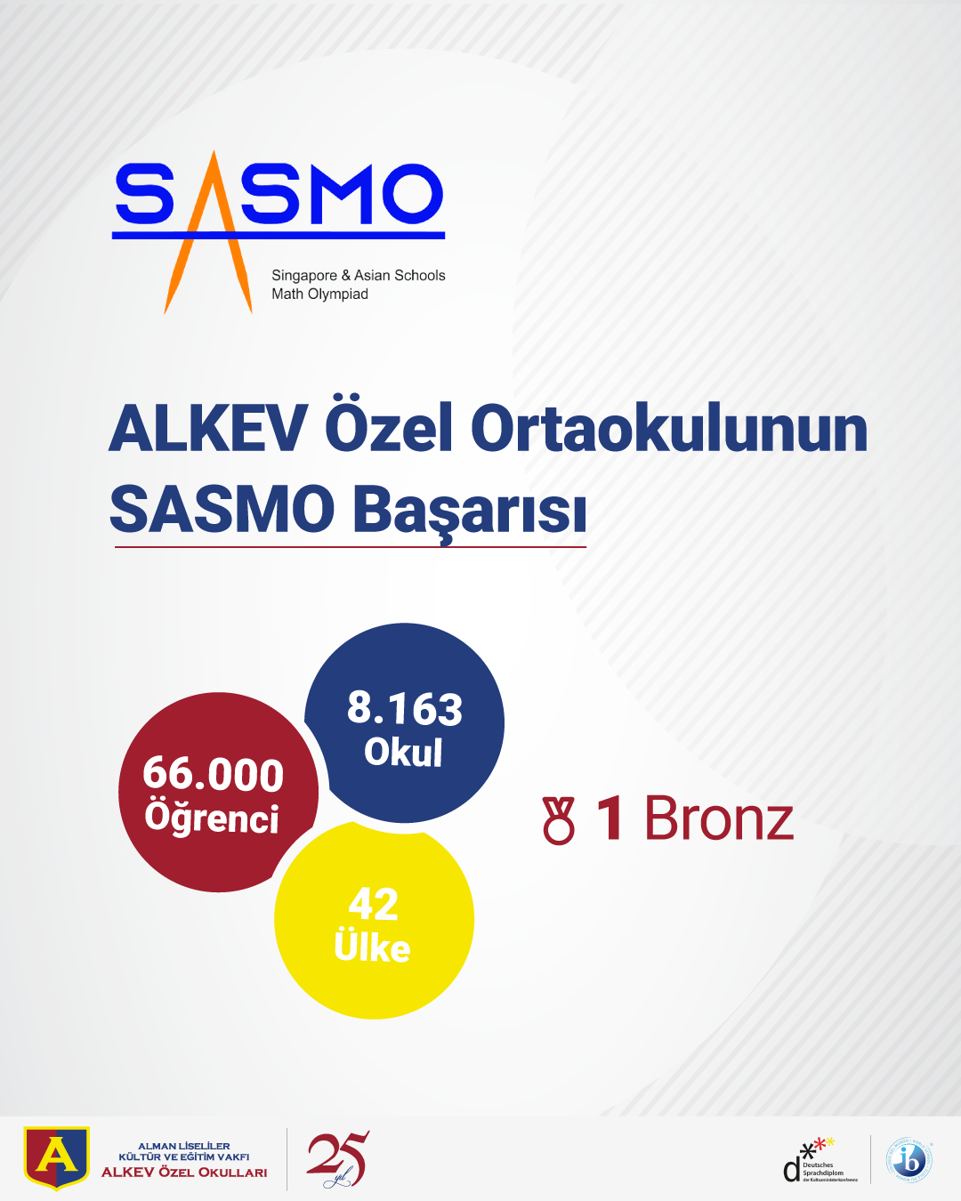 SASMO Matematik Olimpiyatları’nda ALKEV Özel Ortaokulu 6. sınıf öğrencilerimizden Latif Doruk A. bronz madalya alarak Singapur’da düzenlenecek SIMOC 2025 finallerine katılmaya hak kazanmıştır.