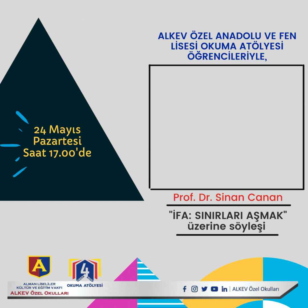 ALKEV Özel Anadolu ve Fen Lisesi Okuma Atölyesi öğrencilerimiz, “İFA İnsanın Fabrika Ayarları” serisinin 3. kitabı olan “Sınırları Aşmak” romanını konuşmak üzere Nörobilim uzmanı Prof. Dr. Sinan Canan ile 24 Mayıs Pazartesi günü saat 17.00’de bir araya geliyor.