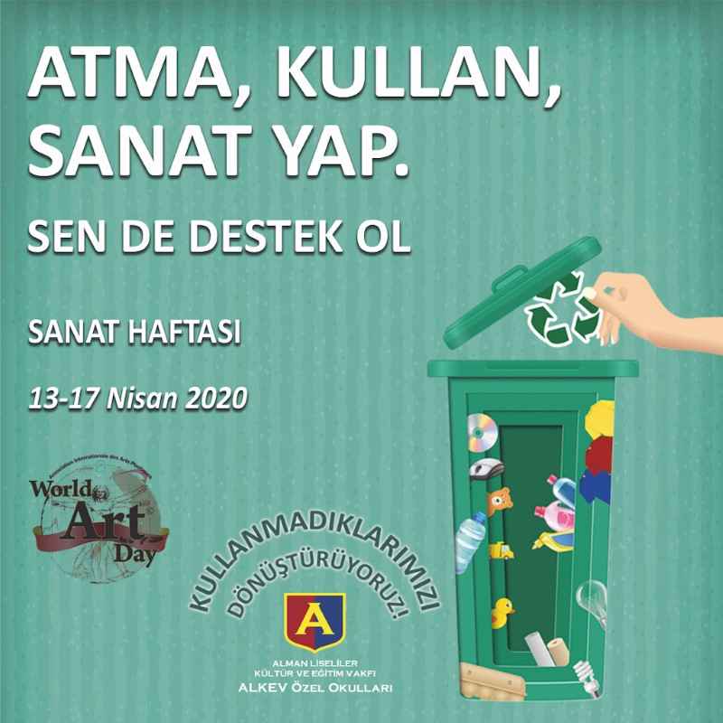 ALKEV Özel Okulları olarak bizler de 2016 yılından itibaren 15 Nisan’ın içinde bulunduğu haftayı görsel sanatlar ve müzik bölümü iş birliğiyle çeşitli temalar doğrultusunda Sanat Haftası olarak kutluyoruz. Bu sene de 13-17 Nisan tarihleri arasında evlerimizde “Atma, Kullan, Sanat Yap” diyerek kutlayacağız.