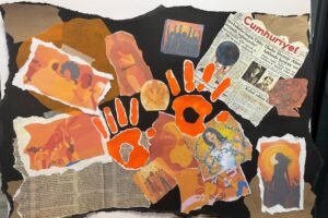 Afiş, akrilik boya, kolaj ve karakalem gibi farklı tekniklerle oluşturulan eserler; şiddete karşı farkındalık oluşturmayı, sesimizi daha güçlü duyurmayı ve dayanışmayı hatırlatmayı amaçlıyor.