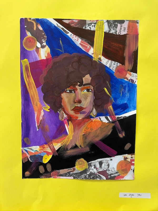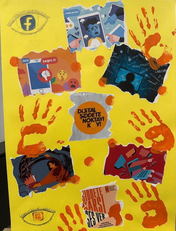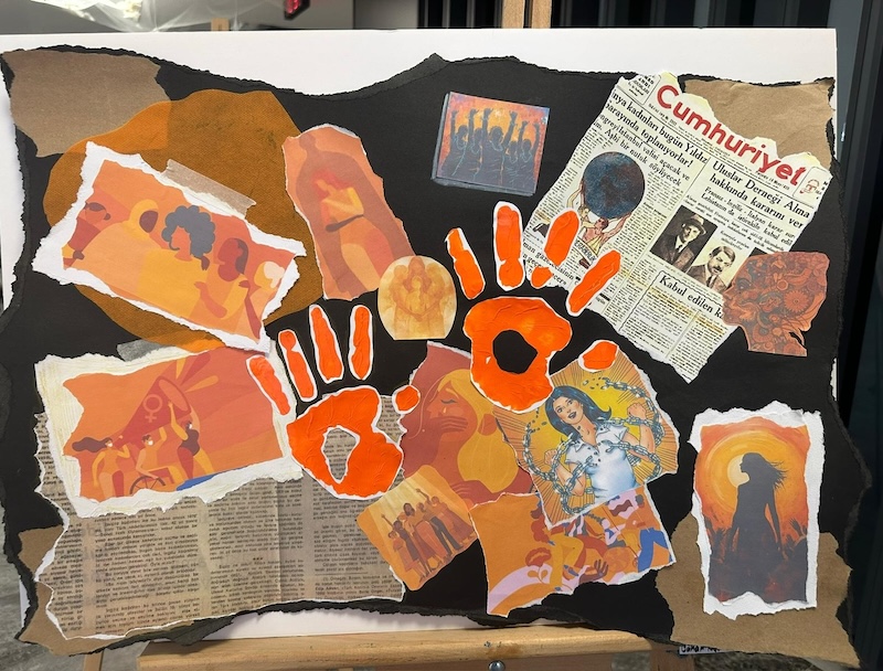 Afiş, akrilik boya, kolaj ve karakalem gibi farklı tekniklerle oluşturulan eserler; şiddete karşı farkındalık oluşturmayı, sesimizi daha güçlü duyurmayı ve dayanışmayı hatırlatmayı amaçlıyor.