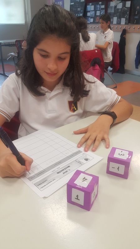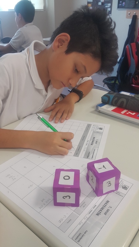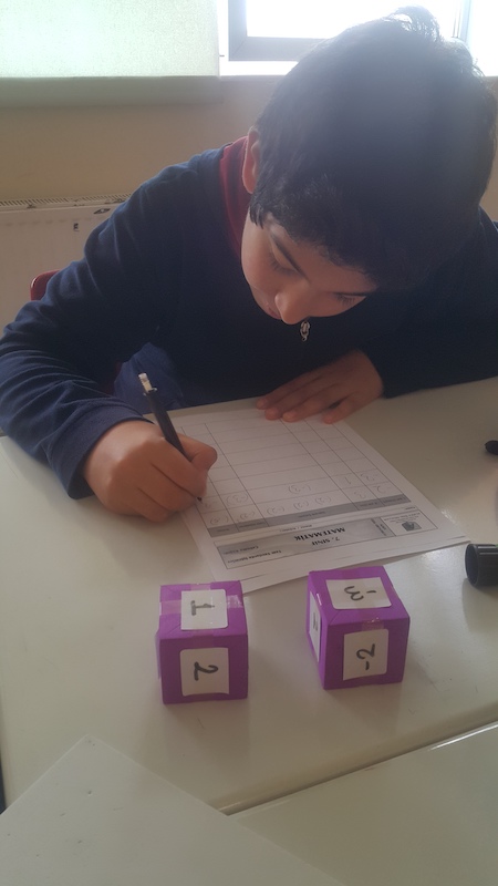 ALKEV Özel Ortaokulu 7. sınıf öğrencilerimizin matematik dersinde ikinci konuları tam sayıların pozitif kuvvetleriydi. Konunun pekişmesi ve matematik dersini somutlaştırmak amacıyla süngerler yardımıyla 2 farklı matematik zarı tasarladık. Kuvvet zarını; her bir yüzeyinde pozitif tam sayılar olacak şekilde, taban zarını da; her bir yüzeyinde hem pozitif hem de negatif tam sayılar olacak şekilde tasarladık. Sınıflarımızı 4’erli gruplara ayırdık. Her gruba kendilerine ait olan zarlar verildi. Gruptaki her öğrenci sırası geldikçe taban ve kuvvet zarını atarak matematik sorusu oluşturdu. Grubundaki tüm arkadaşları ile beraber oluşturulan soruyu düşün eşleş paylaş yöntemi ile çözdüler ve çözümlerini değerlendirdiler. UBD planlarımız doğrultusunda hazırladığımız yönergemize göre tüm öğrencilerimiz kendileri için hazırlanan tam sayılar etkinlik kağıdını zarlar yardımıyla tamamladılar.