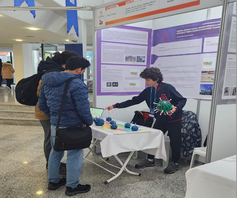 7. Sınıf öğrencilerinden Eymen Efe A. Fizik alanında “Korona Virüsün Yapısal Dinamiklerinden İlhamla Geliştirilen Biyotaklit Temelli Modüler Rasathane Tasarımı” projesi ile,