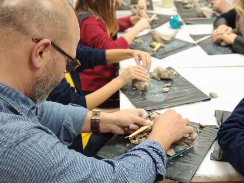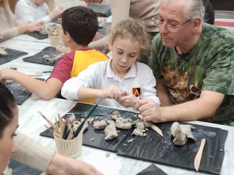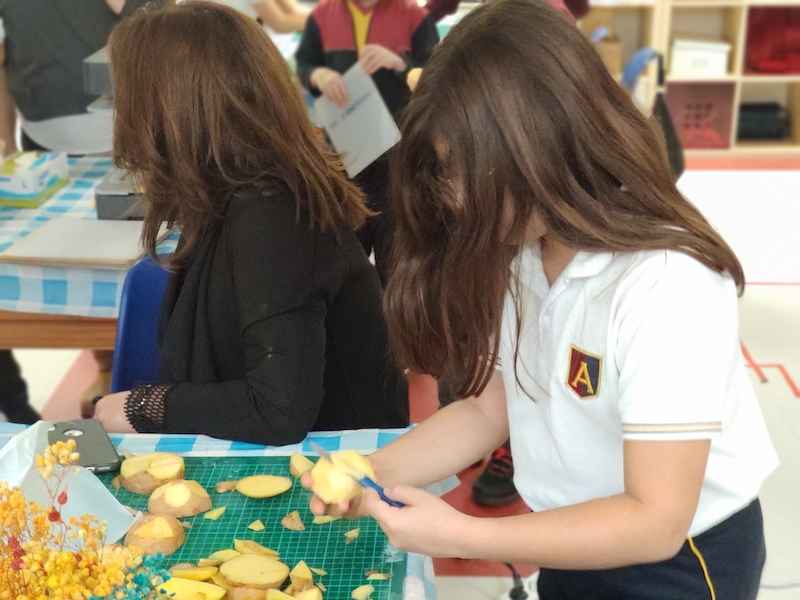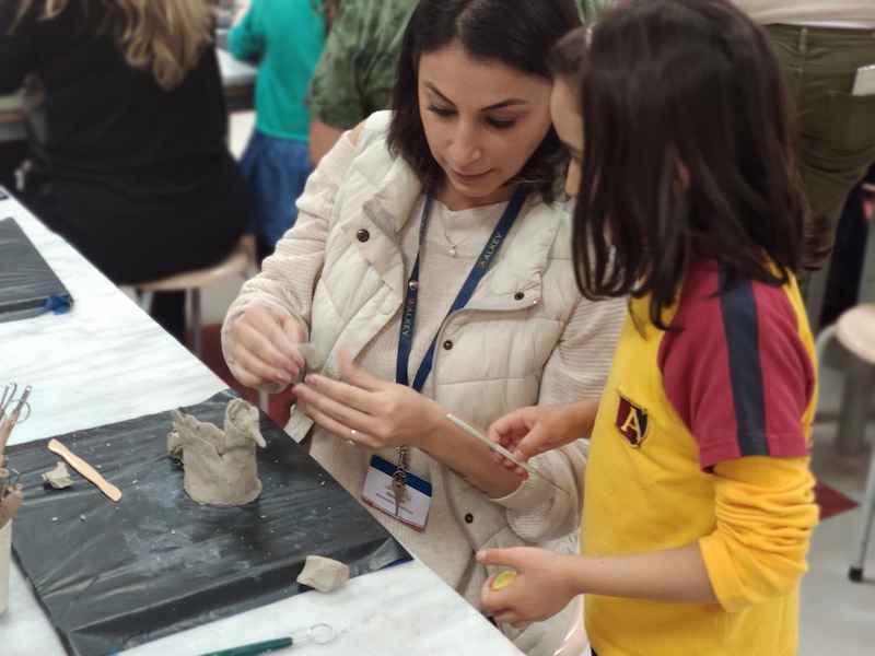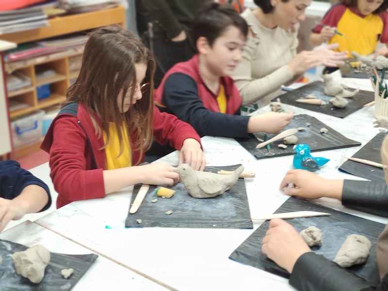 Veli çocuk atölyesi, 14 Ocak Salı günü 4. sınıf veli ve öğrencilerimizin katılımı ile gerçekleşti. Atölye katında Teknoloji ve Görsel Sanatlar Bölümü iş birliği ile düzenlediğimiz etkinliğimizde öğrencilerimiz aileleriyle birlikte ahşap boyama, heykel ve sabun yaptılar. İlk olarak laser box makinesinde kesilmiş olan yeni yıl ağaçlarını, ahşap boyama tekniği ile renklendirdiler ve farklı materyaller kullanarak süslediler. Ardından seramik atölyesine geçen velilerimiz kil kullanarak kuş figürü modülasyonu yaptılar, sabun üretmek üzere patateslere şekil vererek form makinesi ile kalıp aldılar. Kalıplara esans, boya ve çiçek yerleştirerek sabunlarını döktüler. Atölye katında çocuklarımızla velilerimiz gün boyu birlikte çalışma fırsatı elde ettiler.