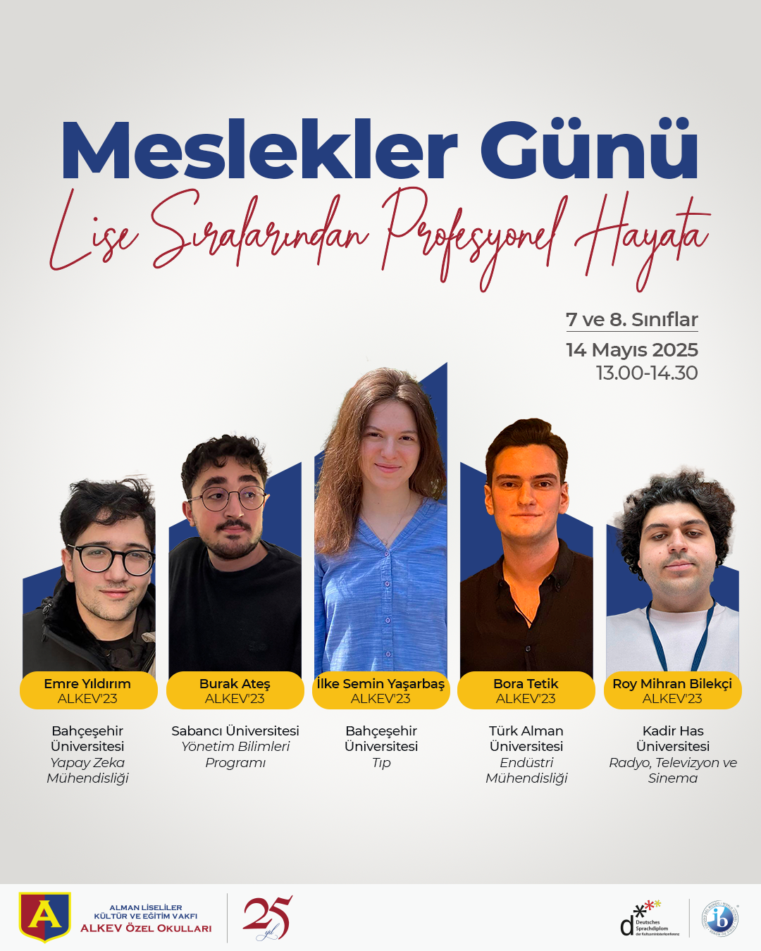 Farklı alanlarda eğitimlerine devam eden ALKEV’23 mezunlarımız, ilham veren hikayeleriyle yeniden aramızda olacak. 14 Mayıs Çarşamba günü saat 13.00’te konferans salonumuzda buluşacak; lise sıralarından üniversiteye ve hayata uzanan yolculuklarını onlardan dinleyeceğiz.