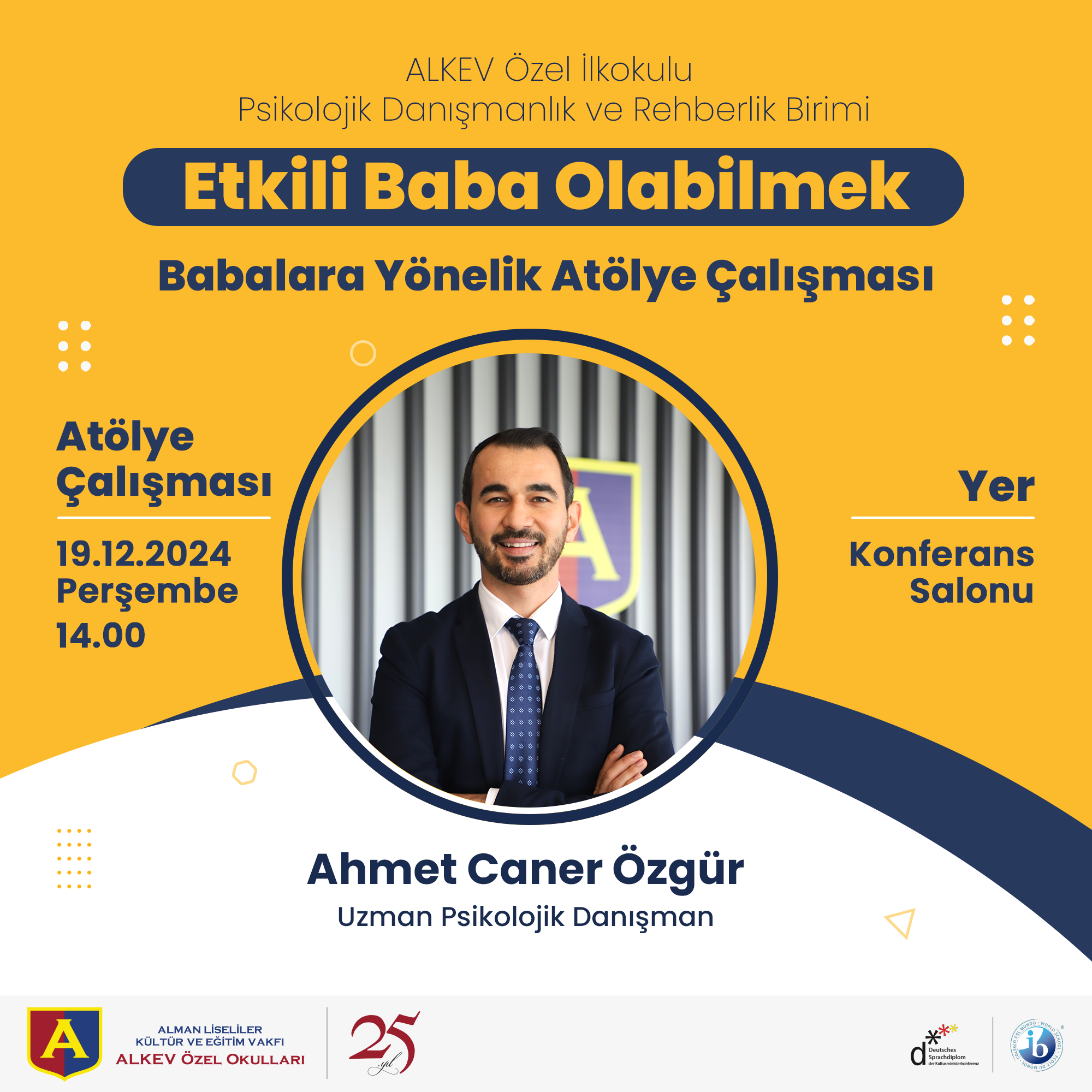 Uzman Psikolojik Danışman Ahmet Caner Özgür tarafından 19 Aralık 2024 Perşembe saat 14:00’te, okulumuz konferans salonunda ilkokul öğrencilerimizin babalarına yönelik “Etkili Baba Olabilmek” konulu atölye çalışması gerçekleştirilecektir.
