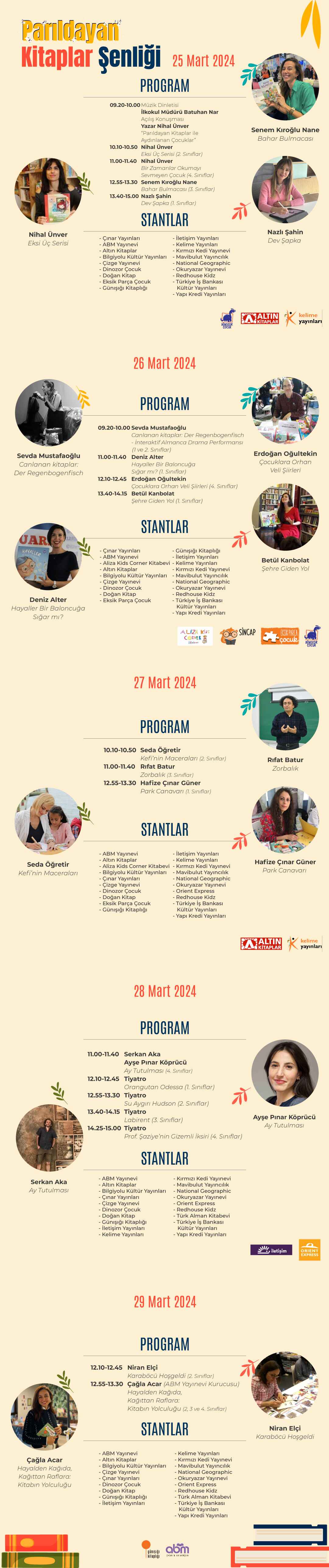 Hafta boyunca okulumuzda öğrencilerimize yönelik kitap konulu 5 tiyatro ve drama gösterisi, 13 yazar söyleşisi, imza etkinliği ve yazar atölyeleri gerçekleştirilecektir. Ayrıca yine hafta boyunca tüm öğrenci ve velilerimiz 09.00-17.00 saatleri arasında 20’yi aşkın yayınevinin katılacağı kitap satış stantları ile bir araya gelme imkanı bulacaktır. Öğrencilerimiz sınıf öğretmenleri ve Almanca öğretmenleri eşliğinde kitap alışverişi yapacaktır. Velilerimiz için de stantlarımız 17.00’ye kadar açık olacaktır.