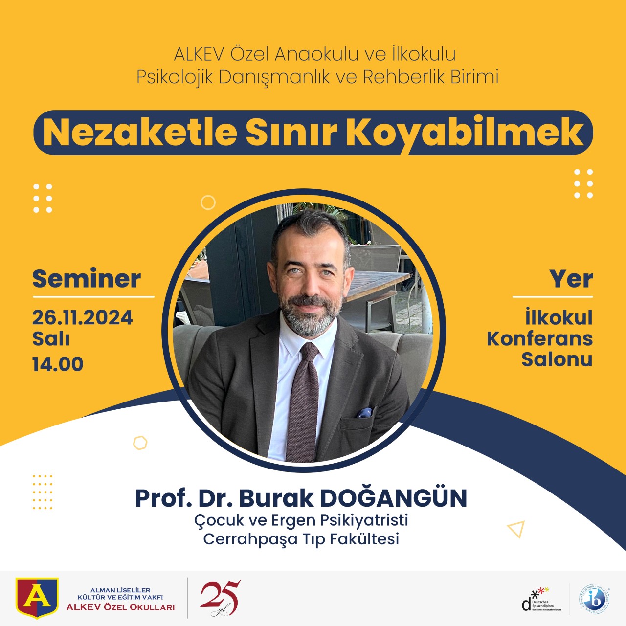 Çocuk Psikiyatrisi Uzmanı Prof. Dr. Burak Doğangün’ün katılımıyla 26 Kasım 2024 Salı saat 14:00’te, okulumuz konferans salonunda “Nezaketle Sınır Koyabilmek” konulu veli semineri gerçekleştirilecektir. Çocuklara sınır koymanın önemi, etkili yöntemleri ve bu süreçte karşılaşılabilecek zorluklarla başa çıkma konularında pratik bilgiler paylaşılacak bu çalışmaya tüm anaokulu ve ilkokul sınıfı öğrencilerimizin ebeveynleri davetlidir.